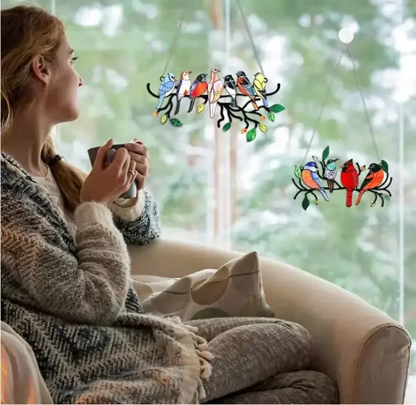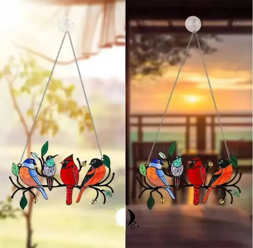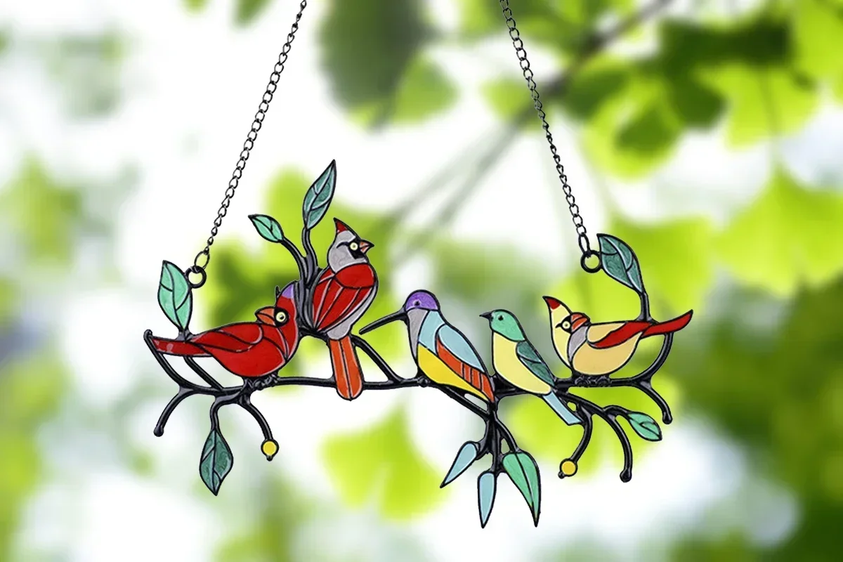 Every morning when the sun shines through these cheery birds, I will remember to appreciate the way our world says "be happy."This stained bird hanging is so vibrant and eye-catching Hummingbird, redbird, bluebird, and Baltimore oriole are very attractive and cute birds.